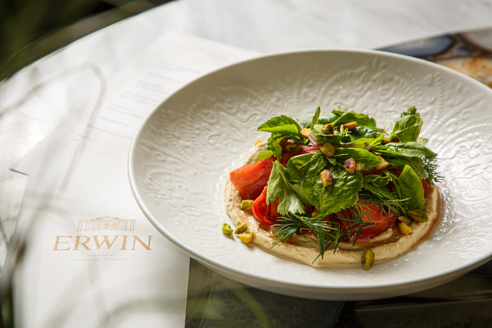 • Салат томатный с хумусом (1150 руб) — свежие томаты и красный лук на подушке из хумуса, дрессинг с юдзу и кунжутным маслом, зелень и фисташка.