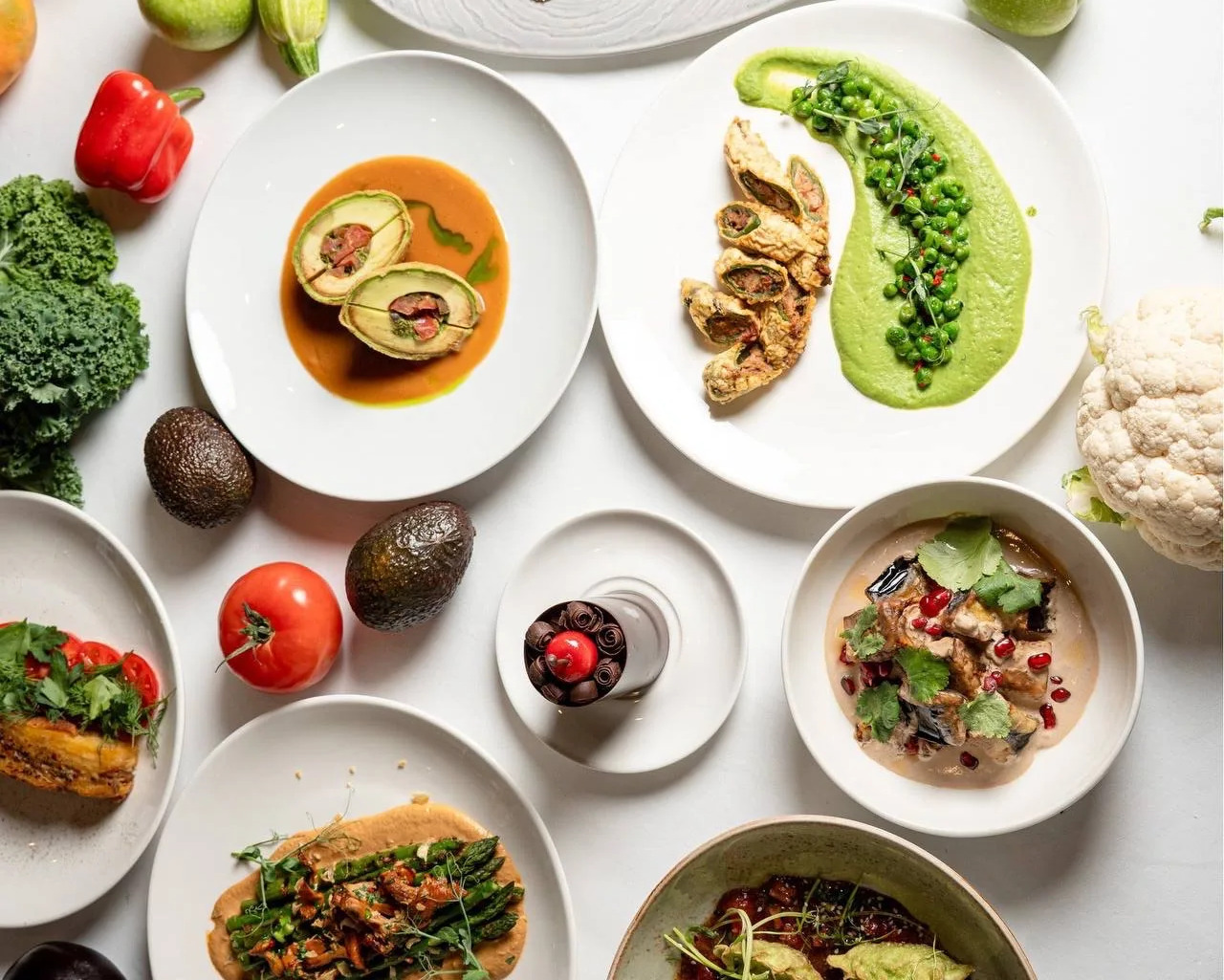 В горячих блюдах представлены вареники с цветной капустой (790 руб.), которые удивляют не только своим ярко-зеленым цветом, но и подаются обжаренными с кунжутным соусом и томатной сальсой; картофельная запеканка (950 руб.), печеная капуста в соусе из баклажанов (810 руб.), плов с лисичками (1100 руб.), гречневая лапша с овощами (950 руб.) с луком порей, цветной капустой, помидорами в соусе «Унаги»; и лобиани в остром перце с соусом из молодого горошка (850 руб.). Также стоит отметить зелёную спаржу с лисичками и кокосовым пюре (1250 руб.).